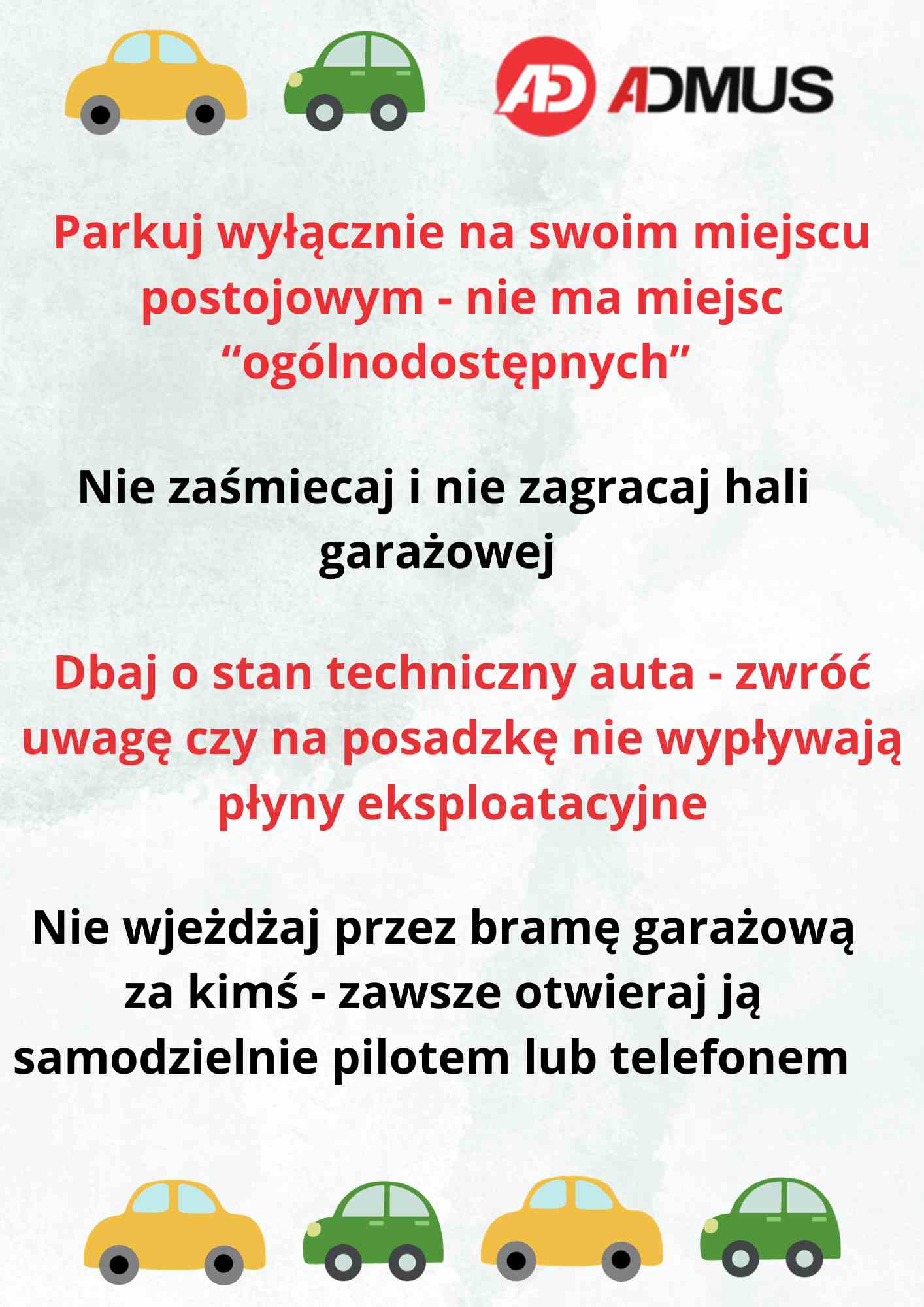 W związku z planowanym myciem hali garażowej uprzejmie prosimy o usunięcie samochodów i oraz innych przedmiotów z miejsc postojowych zgodnie z poniższym harmonogramem: