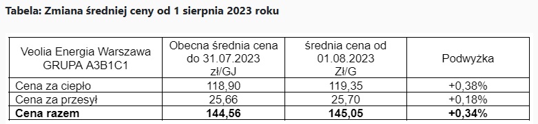 Informujemy, że od 1 sierpnia 2023 zmieniły się ceny dostarczania ciepła przez firmę Veolia Energia Warszawa. Cena za GJ zwiększyła się następująco: