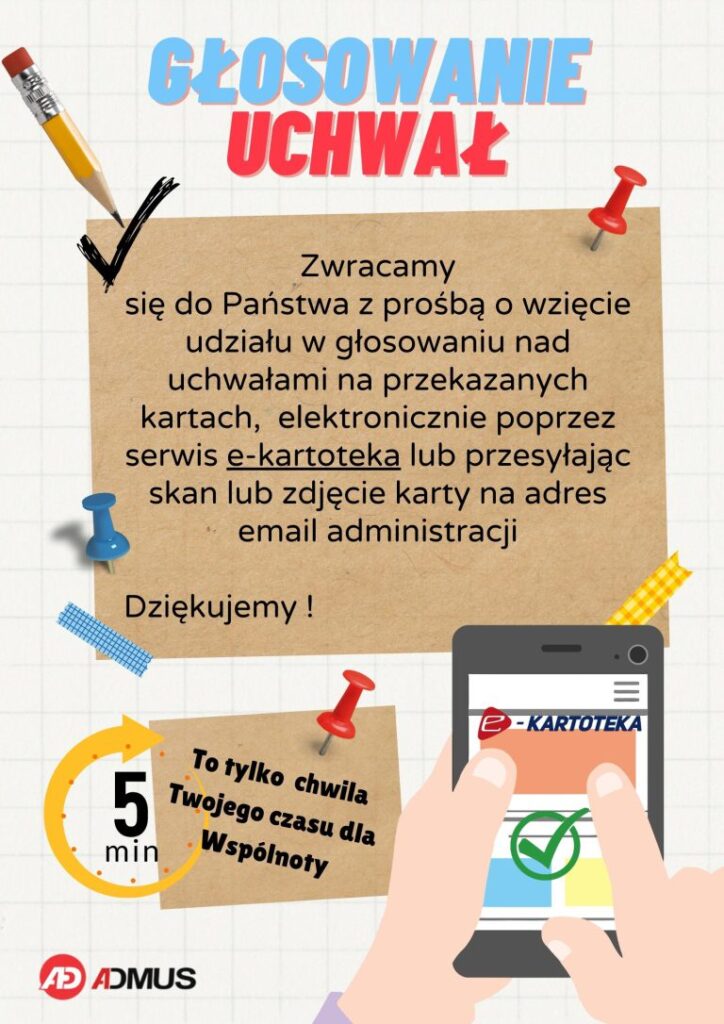Przypominamy Państwu, iż trwa głosowanie nad uchwałami Wspólnoty. Zachęcamy do oddania swojego głosu za pośrednictwem wypełnionej karty (pozostawionej na Ochronie) lub za pośrednictwem e-kartoteki.