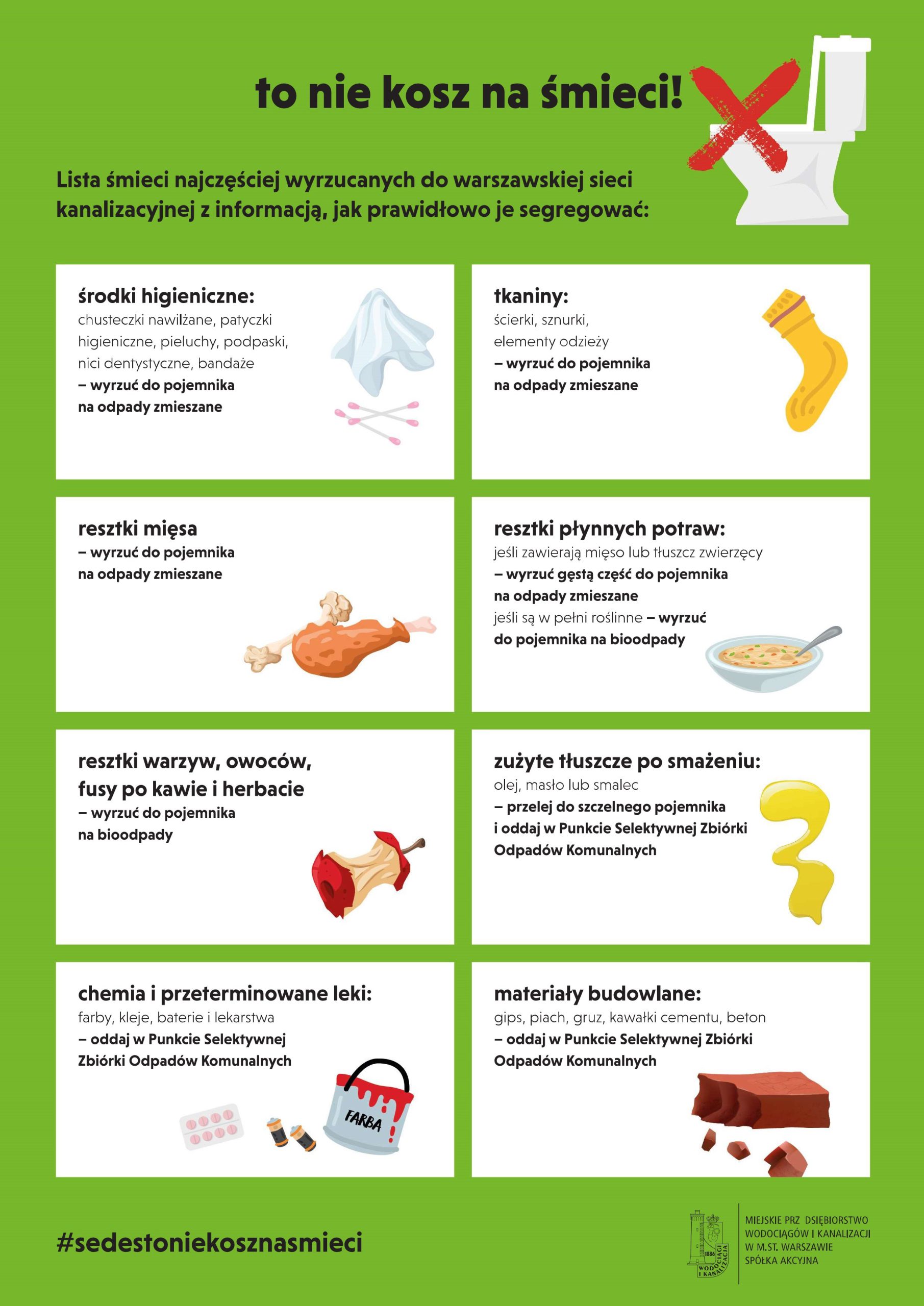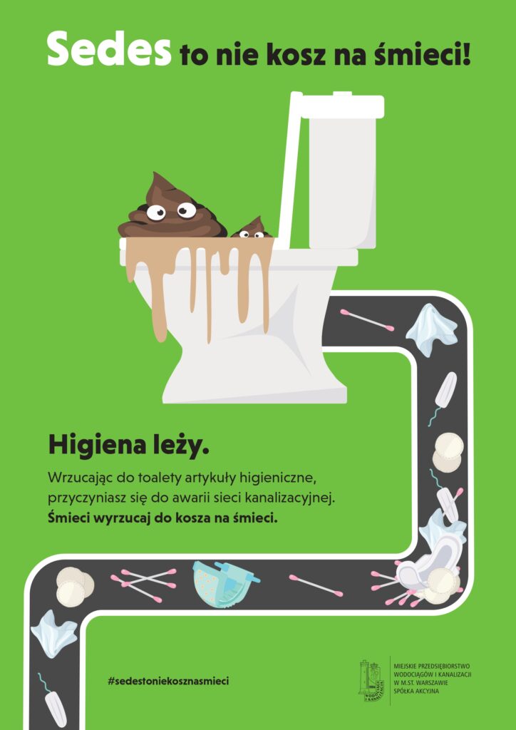 ruszamy z kolejną edycją kampanii Miejskiego Przedsiębiorstwa Wodociągów i Kanalizacji w m.st. Warszawie S.A. pod hasłem ,,Sedes to nie kosz na śmieci”. W tym roku zwracamy uwagę na dwa rodzaje śmieci, które najczęściej trafiają do toalet: