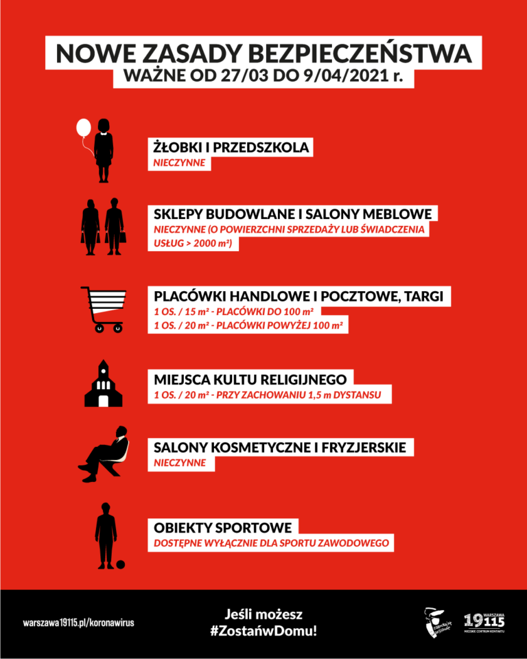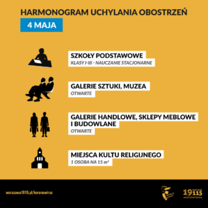 • otwarte sklepy budowlane, meblowe, galerie handlowe: limit 1 osoby na 15 m2, działalność w ścisłym reżimie sanitarnym