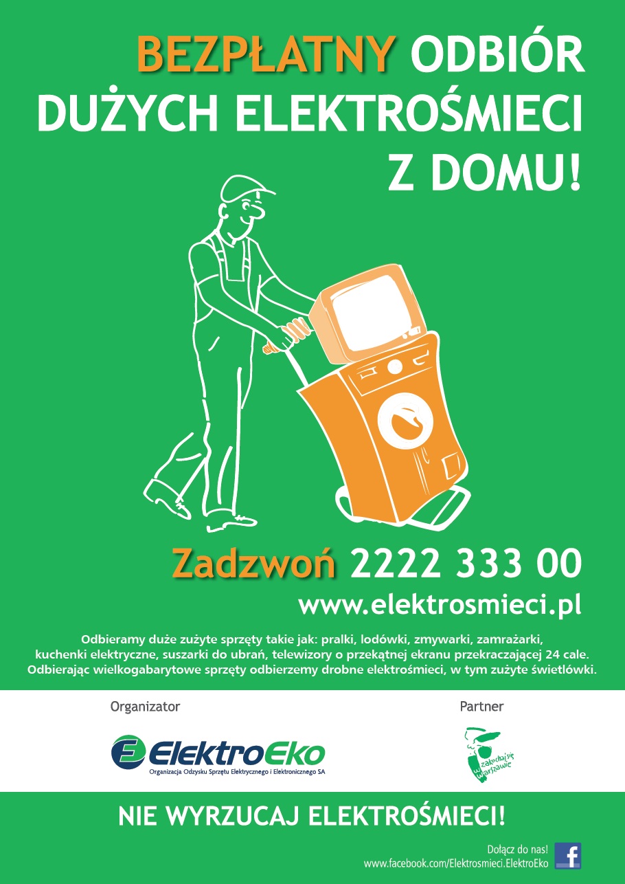bezpośrednio z domów – usługa dotyczy dużych elektrośmieci (np. pralek, lodówek, zmywarek, telewizorów pow.24 cali), ale przy tej okazji może być zabrany również mały sprzęt. Wystarczy zadzwonić pod numer infolinii 22 223 33 00 (od poniedziałku do piątku, w godzinach 9:00-17:00) lub wypełnić formularz. Odpowiednio przygotowany sprzęt (a więc np. odłączony od prądu, wodociągów) odbierany jest ze wskazanej lokalizacji w ustalonym terminie. Bezpłatne odbiory z domów są realizowane jedynie w dni robocze (bez soboty).
