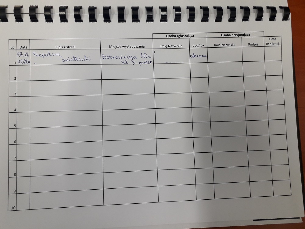 W przypadku, kiedy zauważą Państwo usterkę w częściach wspólnych np. przepaloną świetlówkę przed swoim lokalem prosimy o zgłoszenie tego faktu dokonując wpisu do książki lub o wysłanie maila na adres bobrowiecka10@admus.pl